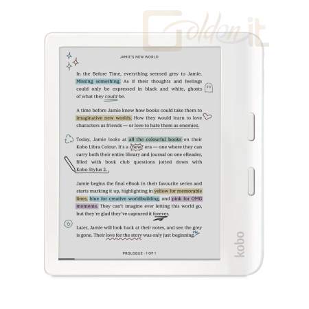 Bemutatjuk eddigi leginspirálóbb eReaderünket: az új Kobo Libra Colourt. Varázsolj varázslatot a margókra azáltal, hogy megjegyzésekkel látod el az oldalakat, rendszerezed a gondolataidat és kiemeled az inspiráló sorokat, mindezt színesben. A Kobo Stylus 2 kompatibilitásnak köszönhetően mélyebben elmerülhet kedvenc történeteiben azáltal, hogy megjelölhet jelentőségteljes pillanatokat és kiemelhet erőteljes részeket a szeretett e-könyvekben.