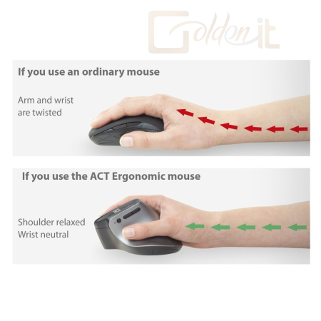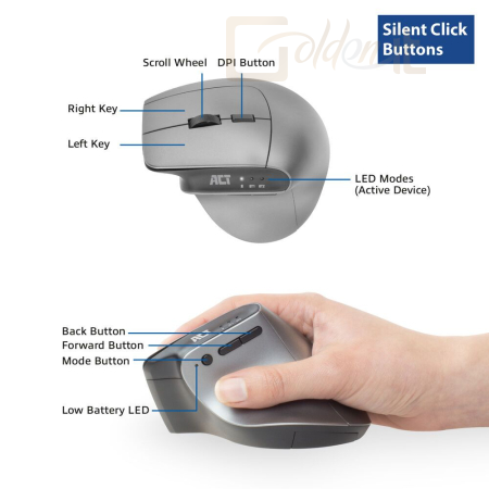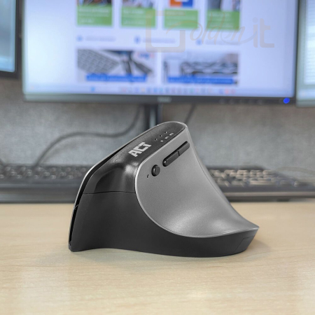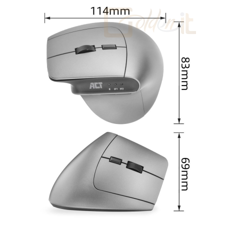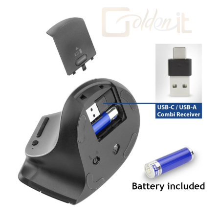 Előzze meg az egérrel kapcsolatos megerőltető sérüléseket az ACT AC5155 vezeték nélküli ergonomikus egérrel. Csatlakoztassa ezt az egeret egyszerre három különböző eszközhöz Bluetooth-on (2x) és az USB-C/USB-A kombinált vevőegységen (1x) keresztül. A vevőegység az egér belsejében tárolható. Válassza ki a kívánt pontosságot a DPI kapcsolóval: 1000/1600/2400. A hozzáférhető hüvelykujjgombok biztosítják a gyors navigációt a weboldalakon. Emellett az egér intelligens energiatakarékos funkcióval és be-/kikapcsolóval rendelkezik.