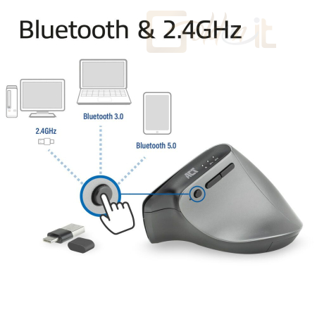 Az AC5155 Ergonomic Multi-Connect vezeték nélküli egér három különböző eszközön használható, beleértve a számítógépeket, laptopokat és táblagépeket. Csatlakoztassa az egeret két eszközhöz Bluetooth-on keresztül, vagy egy számítógéphez vagy laptophoz a mellékelt 2 az 1-ben vevőegységen keresztül. Váltson az eszközök között az egér oldalán található dedikált gombbal. Az egéren lévő LED jelzi, hogy melyik eszköz aktív.