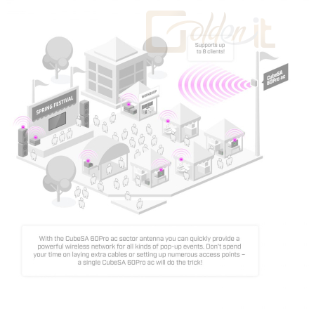 Ha több eszközt kell csatlakoztatnia – vessen egy pillantást a CubeSA 60Pro AC szektorantennára . A pont-többpont módban körülbelül 600 méteres távolságokat elérő készülék nagyon hasznos lehet mindenféle rendezvényszervezésben: élő show-któl, fesztiváloktól és workshopoktól az építkezésekig, pop-up oltási klinikákig stb. Nincs szükség bonyolult vezetékes telepítésekre minden helyen – a hordozható és praktikus CubeSA 60Pro ac gondoskodik róla! A beállítástól függően a távolság még nagyobb is lehet. Például az olyan eszközökkel, mint a MikroTik nRAY , akár 800 métert is elérhet .