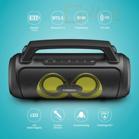 A LAMAX PartyGo1 Play hordozható hangsugárzóval bármilyen esemény színhelye. Ez a kompakt készülék több, mint amilyennek látszik, hatalmas 50 W teljesítményt rejt magában. A BeatBass® technológiánknak köszönhetően készen áll arra, hogy teljes, gazdag hangzást biztosítson, bárhová is megy. Akár nagyot dobál, akár egy hétköznapi kerti grillezést élvez, ez a hangszóró a megfelelő hangulatot teremti 3 LED-es világítási móddal és a mellékelt mikrofonnal karaoke szórakozáshoz vagy rendezvényszervezéshez. A Bluetooth 5.3 gyors párosítást és megbízható, hibamentes átvitelt tesz lehetővé 18 méterig, és USB-n, microSD-n vagy AUX-on keresztül is csatlakoztathatja dallamait. Ráadásul az USB-A bemenetnek köszönhetően a hangszóró tápegységként is funkcionál. A zene nem áll le, ha mozgásban van, mivel a hosszú élettartamú akkumulátor akár 15 órán keresztül is megőrzi a dallamokat. A praktikus heveder megkönnyíti a hordozhatóságot, és ha több hangra van szüksége? Könnyedén párosítsa egy másik hangszóróval a True Wireless technológia segítségével. Nincs lejátszási lista? Nincs probléma a beépített FM rádióval. Ráadásul a hangszóró támogatja a hangasszisztenseket, így még könnyebbé válik a zene és a telefonhívások kezelése.