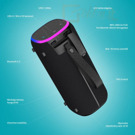 Amint kiveszed a LAMAX StarCube1-et a táskádból, máris egyértelmű, hogy megérkezett a buli sztárja. Nem egy óriás, de modern, elegáns dizájnja azonnal megragadja a tekintetet. A függőleges, hordozható kialakítás és a 4 állítható LED-effektus valóban felkelti a figyelmet, különösen, ha akár 40 W teljesítményt is lead. Akár 18 órás akkumulátor-üzemidejével a buli folytatódhat, és ha eljön az újratöltés ideje, csak csatlakoztassa az USB-C kábelt. Szeretnél egy kicsit magasabb fokozatra kapcsolni? Használja a TWS funkciót egy másik hangszóró csatlakoztatásához a még nagyobb hangzás érdekében. A kétsávos hangszórók tiszta, kiegyensúlyozott hangzást biztosítanak gazdag basszusokkal és világos magas hangokkal, a Bluetooth 5.3 zökkenőmentes párosítást biztosít a különböző eszközökkel, a hangszóró pedig egyszerűen kezelhető. A csatlakozási lehetőségek széles skálájának, köztük a microSD-nek és a különböző formátumok támogatásának köszönhetően a LAMAX StarCube1 mindenre készen áll.