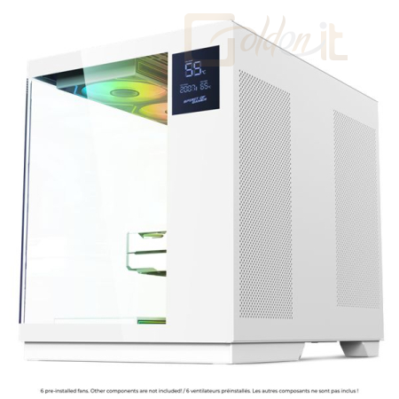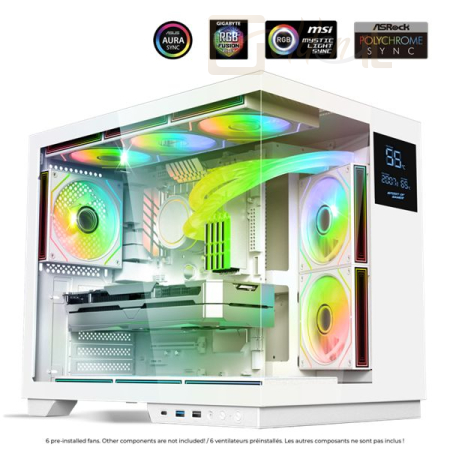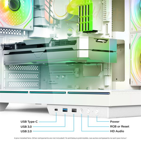 ATX, White, 3x3,5", 1x2,5", 1xUSB2.0, 1xUSB3.0, 1xUSB Type-C, Audio, Táp nélkül, 495x422x365mm, Ventilátor:6x12cm, Tempered glass window, RGB, Gamer