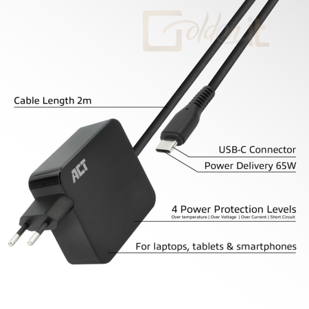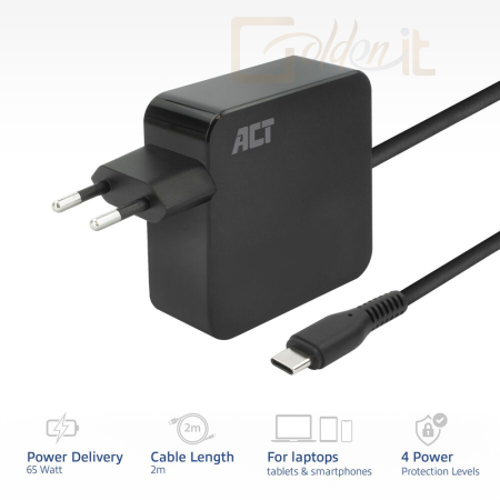 Notebook kiegészitők ACT USB-C laptop wall charger 65W with Power Delivery profiles 2m Black - AC2010