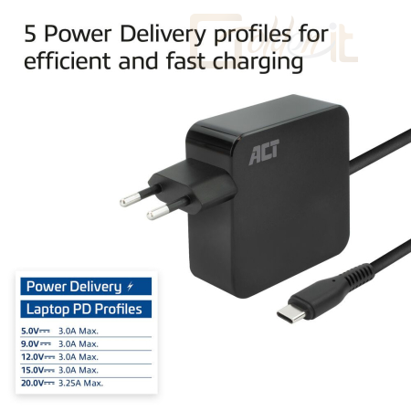 Az AC2010 USB-C laptop fali töltő 65W tökéletes társ az USB-C töltőporttal rendelkező laptopodhoz. Az előre meghatározott Power Delivery profiloknak köszönhetően laptopját mindig a megfelelő energiamennyiséggel tölti fel. Van USB-C-vel rendelkező okostelefonja/tabletje? Az AC2010 az okostelefonodat/tabletedet is tölteni fogja.