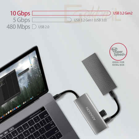 A többportos USB-C 10Gbps AXAGON HMC-5G21 SPEEDSTER 5in1 hub öt porttal bővíti laptopját, számítógépét vagy telefonját. A csatlakozás 13 cm-es USB-C kábelen keresztül történik. Így azonnal elérhetővé válik egy 4K monitor és más USB perifériák csatlakoztatása. Ezzel egyidejűleg lehetőség van a laptop Power Delivery technológián keresztüli töltésére is. A Thunderbolt 3/4/5 kompatibilitásnak köszönhetően egyszerű és kompakt dokkolóállomásként is használható például Apple MacBook Air vagy Pro készülékhez.
