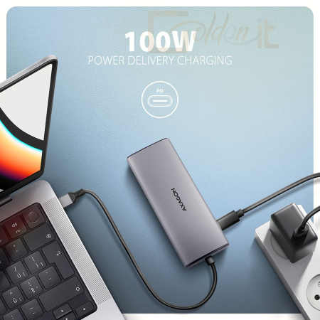 Egy másik USB-C (PD) port a Power Delivery 3.0 technológiát használó laptopok akár 100W teljesítményű tápellátására és egyidejű töltésére szolgál. Csatlakoztasson egy kompatibilis USB-C Power Delivery töltőt a hubhoz, és csatlakoztassa a hubot egy Power Delivery-t támogató laptophoz. Ez egy USB-C portot takarít meg.