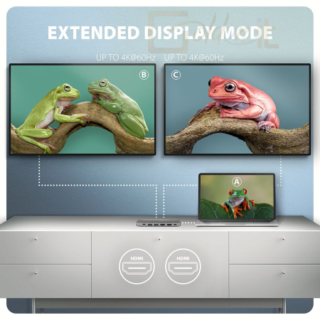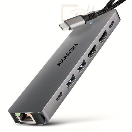 A többportos USB-C 5Gbps AXAGON HMC-7HX2 DUAL 4K DISPLAY 7in1 hub hét porttal bővíti laptopját, számítógépét vagy telefonját. Laptopját 15 cm hosszú USB-C kábelen keresztül csatlakoztatja a hubhoz. Azonnal van csatlakoztatása egy két 4K monitorról, három USB-eszközhöz és egy RJ-45-ös csatlakozóhoz egy Gigabit Ethernet hálózathoz. Lehetőséget kap arra is, hogy a Power Delivery technológiát használó laptopot egyidejűleg táplálja. A portreplikátor így egy univerzális 7in1-ben dokkoló állomás funkcióját tölti be a modern laptopokhoz.
