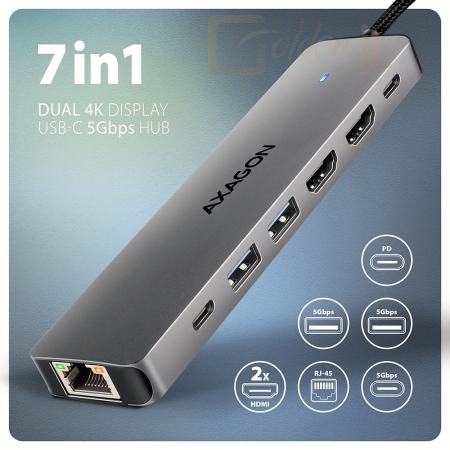 Notebook kiegészitők AXAGON HMC-7HX2 USB-C 5Gbps Dual 4K Display 7in1 Hub Aluminium - HMC-7HX2