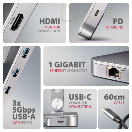 Az AXAGON HMC-STND 7in1 Hub & Stand egy egyedülálló multifunkciós hub, amely egy laptop- vagy táblagép-állványba van integrálva. Ez a hub további hat porttal bővíti laptopját vagy táblagépét. A laptopot egy 60 cm hosszú USB-C <-> USB-C kábelen keresztül csatlakoztatja a hubhoz. Ez azonnali csatlakozást biztosít egy monitor, három USB-eszköz, egy RJ-45 csatlakozó Gigabit Ethernet és Power Delivery számára. A két ízülettel állvány javítja az ergonómiát és a munkakényelmet, 10" és 16" közötti eszközökhöz alkalmas. Ideális 7in1-ben dokkolóállomás Windows laptopokhoz és Apple MacBook Air vagy MacBook Pro számítógépekhez.