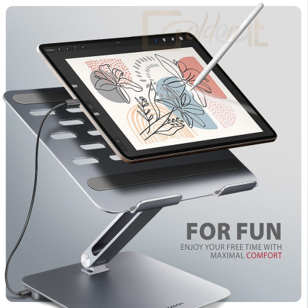 Ennek az állványnak az elegáns kialakítása nemcsak stílusossá teszi íróasztalát, hanem praktikus funkciókat is kínál. Az alap és a hubfedél robusztus alumíniumöntvényekből készült, amelyek passzív hűtést biztosítanak, és garantálják az állvány és a hub hosszú élettartamát és megbízhatóságát. Emellett az alapon található kivágások optimalizálják a laptop hőelvezetését, ami hozzájárul a nagyobb teljesítményhez és a készülék hosszabb élettartamához.