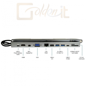 | 1x HDMI (4K UHD - 3840 x 2160 @ 30 Hz) 1x Mini-DisplayPort (4K UHD - 3840 x 2160 @ 30 Hz) 1x VGA (FHD - 1920 x 1080 @ 60 Hz) 2x USB 3.2 Gen 1x1 Type A 1x USB 2.0 Type A 1x USB-C 1x USB-C Power Delivery 100 W 1x LAN (RJ45) 1x SD/Micro-SD/TF card reader 1x 3,5 mm Audio jack |