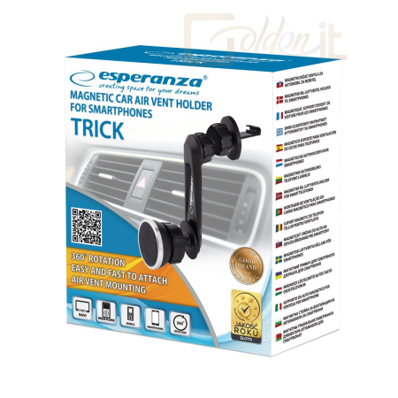 Mágneses autós tartó okostelefonokhoz Esperanza TRICK az autó szellőzőnyílására szerelve. Lehetővé teszi a telefon gyors és kényelmes rögzítését anélkül, hogy karcolásokat vagy sérüléseket okozna a burkolatán.
