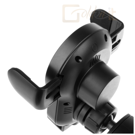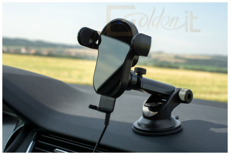Az automatikus rögzítéssel ellátott speciális fogónak köszönhetően a telefon behelyezése a tartóba egyszerű feladat, amelyet egy kézzel is kényelmesen kezelhet. Csak helyezze a telefont a tartó aljára, a bilincsek biztonságosan rögzítik a behelyezett telefont, és a vezeték nélküli töltés azonnal megkezdődik. A telefon fogása szilárd, és könnyedén ellenáll a vezetés okozta összes ütésnek. A tartó kinyitásához csak használja a felső oldalán található érintőgombot. A belső kondenzátornak köszönhetően a tartó akkor is képes elegendő energiát megőrizni a nyitáshoz, ha a motor le van állítva, vagy ha nincs a kulcs a gyújtásban.