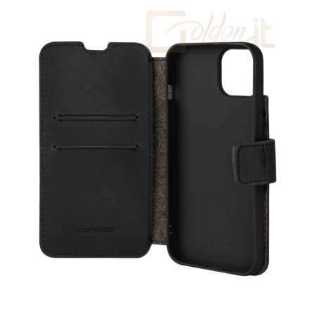 Az elülső kinyithatós rész biztonságosan védi a kijelzőt, és mágneses zárral záródik. A tok kinyitása után a belső oldalon két zsebet talál a bankkártyák számára és egy nagyobb bankjegyzsebet.