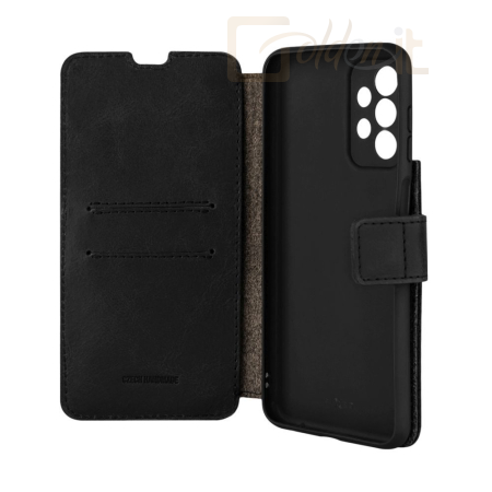 Az elülső kinyithatós rész biztonságosan védi a kijelzőt, és mágneses zárral záródik. A tok kinyitása után a belső oldalon két zsebet talál a bankkártyák számára és egy nagyobb bankjegyzsebet.