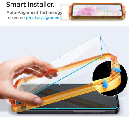 A Spigen "AlignMaster" sorozatának edzett üvegét a telefon elejére tökéletesen szabott rögzítőkerettel rögzítették, amelynek köszönhetően tökéletesen elhelyezhető a képernyőn. A gyártó annyira leegyszerűsítette a rögzítési folyamatot, hogy az minden felhasználó számára teljesen intuitív.