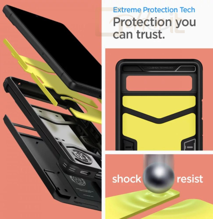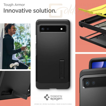 A sorozat esete Kemény páncél márkák Spigen a cég új borítója. Kétrészes szerkezete kopásálló hőre lágyuló műanyagból és erősítő polikarbonát keretből készül. A fedél belsejében technológiai hab formájában töltődik be, amely további védőréteget biztosít a dudoroktól vagy a készülék leesésétől.