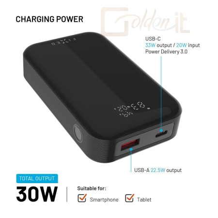 A kompakt Zen 10 Pro power bank akár 30 W-os gyorstöltést támogató Power Delivery 3.0 technológiával megbízható energiát biztosít telefonja, táblagépe és más USB-C eszközök töltéséhez. Az USB-C és USB-A portoknak köszönhetően két eszköz egyidejű töltését teszi lehetővé, így ideális a napközbeni vagy utazás közbeni folyamatos töltéshez. Az intelligens LCD-kijelző világosan mutatja az akkumulátor kapacitását és az egyes portok aktuális kimeneti teljesítményét külön-külön, így mindig áttekintheti a töltés előrehaladását. Maga a power bank egy akár 20 W teljesítményű USB-C porton keresztül tölthető a csomagban található USB-C/USB-C kábelen keresztül. Kompakt méreteinek és kis súlyának köszönhetően a FIXED Zen 10 Pro power bank könnyedén elfér bármelyik kézitáskában vagy hátizsákban. Ezért ideális útitárs, amely bárhol és bármikor áramot biztosít eszközeidnek.