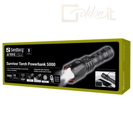 A Sandberg Survivor Torch Powerbank 5000 tökéletes felszerelés kalandozáshoz, expedícióhoz és kempingezéshez – és vészhelyzetben megmentheti az életét. Az erős, beépített akkumulátor hosszan tartó erős fényt és vészhelyzeti villogást biztosít több órán keresztül. A zseblámpa oldalán lévő USB-port lehetővé teszi okostelefonja töltését. Rendkívüli robusztus kialakításának köszönhetően zord körülmények között is kitart. A fénykúpot szükség szerint állíthatja be. Mindemellett a zseblámpa vészkalapácsként is használható.