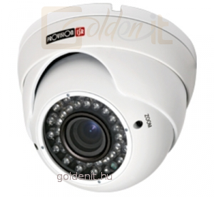 kültéri inframegvilágítós mechanikus Day&Night dome kamera, 1/3''-os DIS CMOS chip, EcoSight DSP chip, 650Tvsor, 0,1lux/F2.0 (0lux 25m-en belül bekapcsolt infraLED-ekkel), ICR, AES, AGC, AWB, 2D DNR, 2,8-12mm-es variófókuszos objektív, 36db infraLED, IP66, 12Vdc(400mA), fehér fém burkolat, 2 év garancia