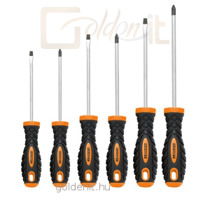 6 db-os csavarhúzó készlet: Króm-vanádium acél szár, ultra kényelmes és csúszásmentes markolat. Visszazárható, áttetsző csomagolás gumi rögzítővel és akasztóval. A szett tartalma: 3 db lapos csavarhúzó, 3 db csillag csavarhúzó