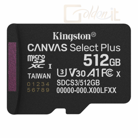 USB Ram Drive Kingston 512GB microSDXC Canvas Select Plus Gen3 Class 10 UHS-1 A1 V30 adapter nélkül - SDCS3/512GBSP